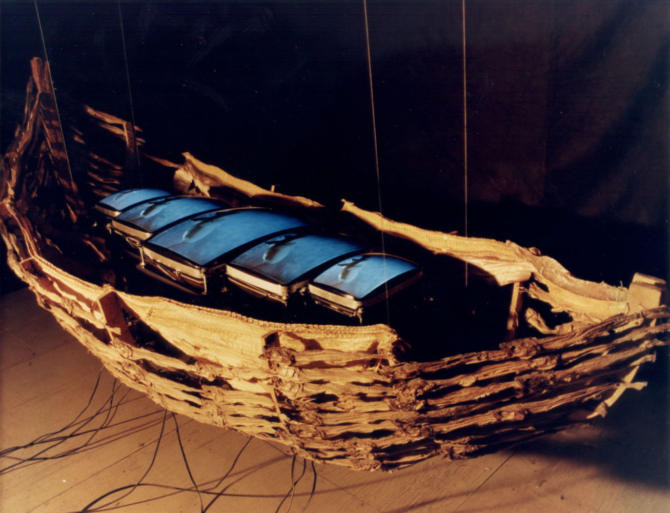 In VIDEO PROJECTION ON A BLOCK OF ICE (1994), moving images are projected onto a surface which is continually melting away throughout the exhibit, showing pictures of a fetus within the womb on one side, contrasting with footage of battling pit bulls around the corner, and the viewer is left to deal with the combination of stimuli. The melting ice emphasizes the transient nature of the medium Ð the illusion lives on after the tool used to convey it is gone. In these and many other works, Wojtek Ulrich has employed whatever media he feels best suited to express his ideas, and continues to avoid restricting himself to any particular style or format. THE BOAT will be on exhibit at The Chelsea Art Museum (NYC) beginning March 7, 2003. |